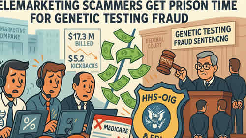 Two men from Texas and Florida were sentenced today to four years and two years in prison, respectively, for their roles as leaders of a marketing company that solicited Medicare beneficiaries for medically unnecessary genetic testing. The Florida man received an additional two years in prison, to be served concurrently, for his role in falsifying the ownership information in Medicare enrollment documentation for a clinical laboratory.